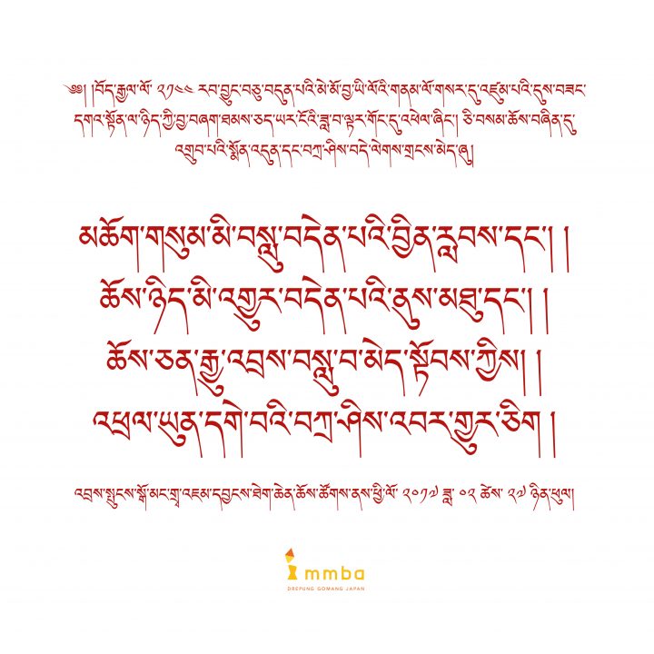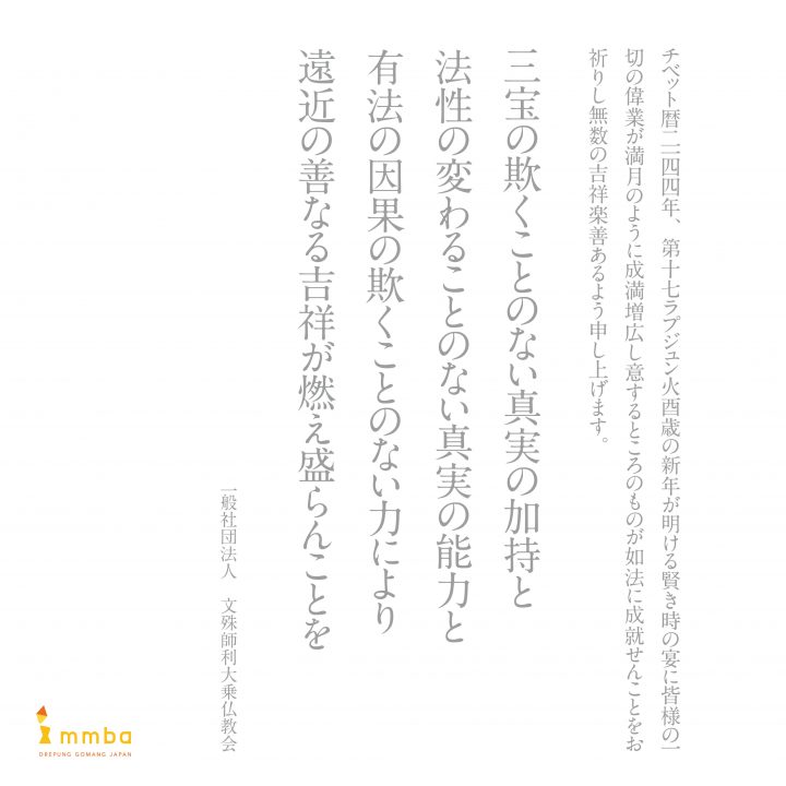 チベット暦2144年、第十七ラプジュン火酉歳の新年が明ける賢き時の宴に皆様の一切の偉業が満月のように成満増広し意するところのものが如法に成就せんことをお祈りし無数の吉祥楽善あるよう申し上げます。