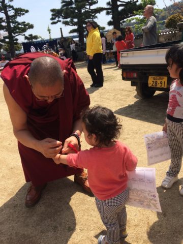 アボさんにまっすぐ手を伸ばしてじっとスンドゥを巻いてもらっている幼児のおじいさまは、ずっとケンスルリンポチェの法話会に参加されておられました。今になってもその法話を忘れないと仰っていて、みんなでしみじみと過ごしました。
