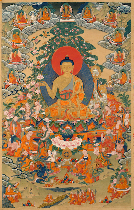 「世尊よ、この諸天は供養塔を建立せんとする者ばかりである。この曼荼羅を会衆とするいまこの時、何卒、梵天の福徳を増広させ、諸天、魔、梵天世間、沙門、婆羅門といった九生、なかでも比丘、比丘尼、優婆塞、優婆夷たちの福徳が極めて多く増大するために、世尊よ、どうか彼らに法を説示し給われんよう請い願わん。」