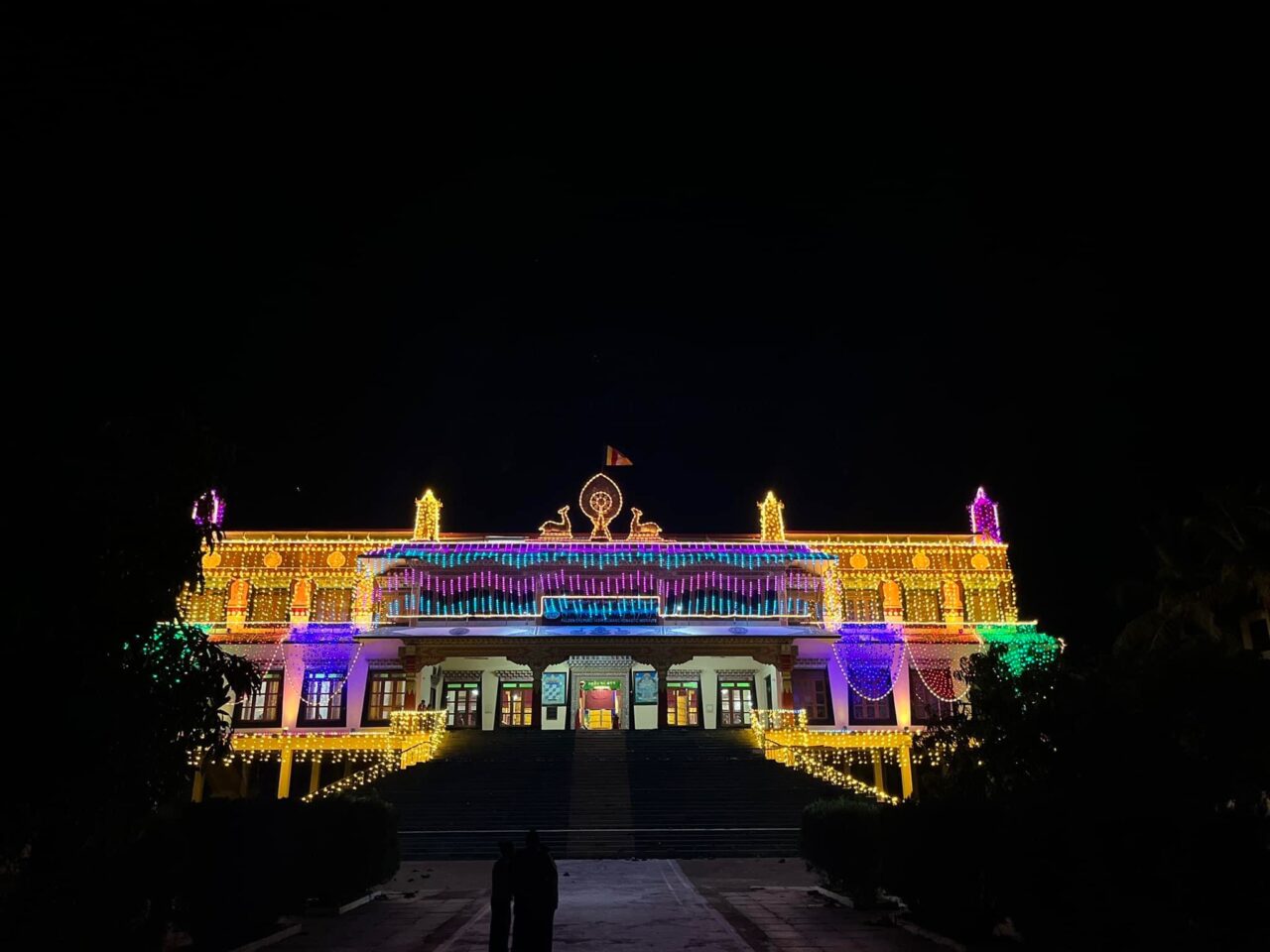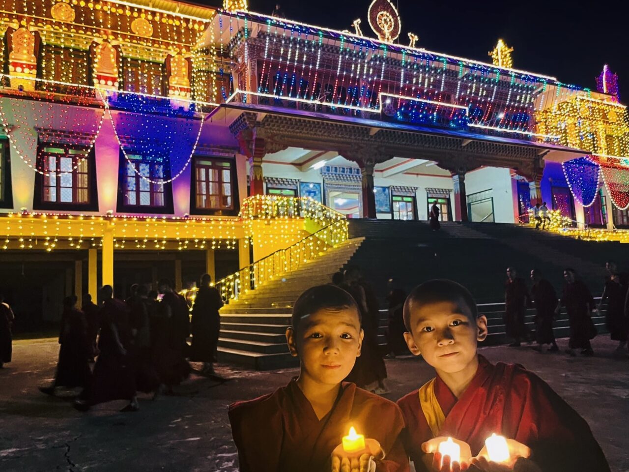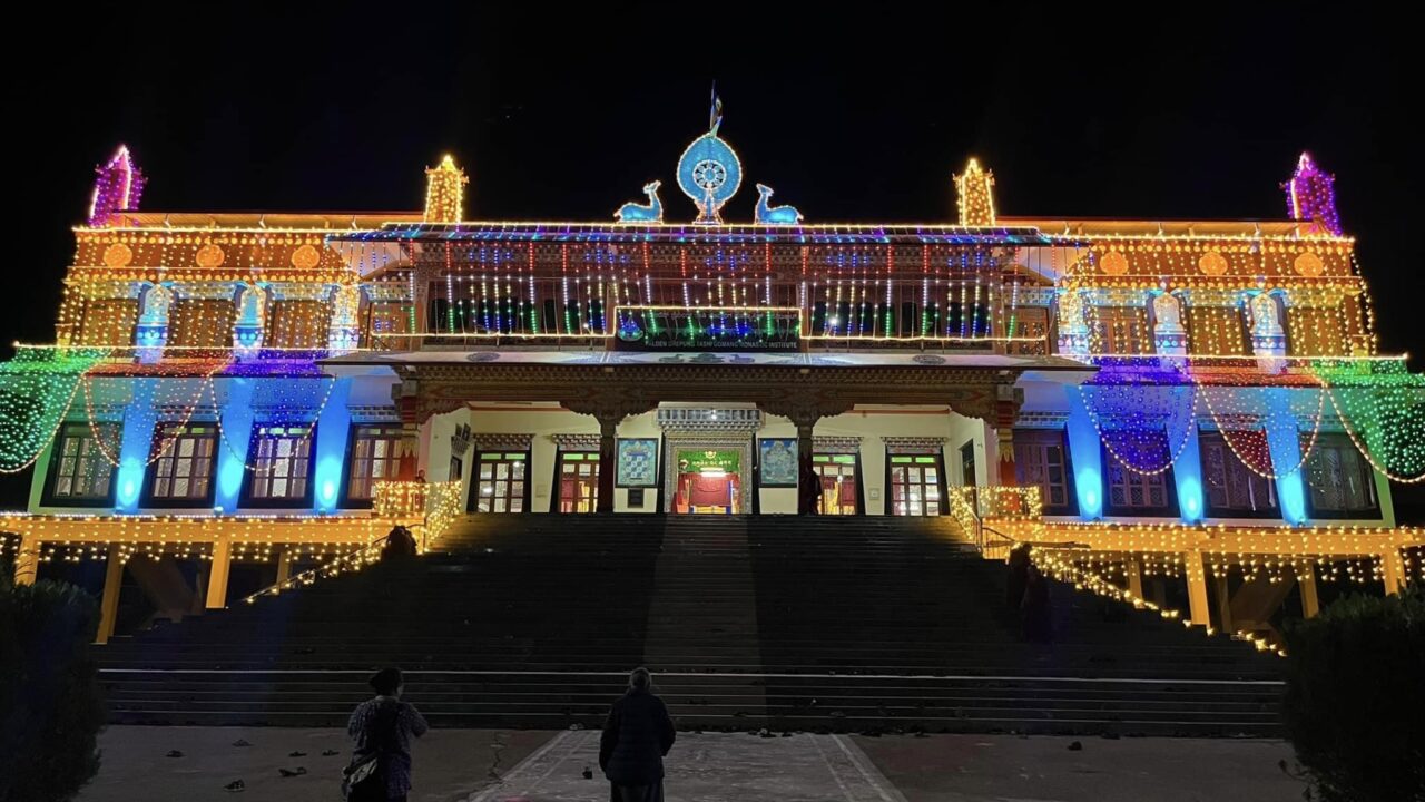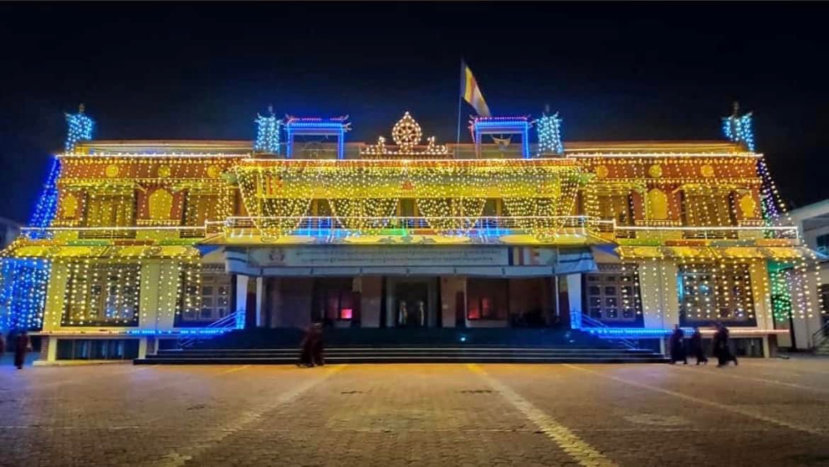 コロナ禍のため海外に帰国した留学僧なども徐々に僧院に戻りつつあり、ダライ・ラマ法王をはじめとする偉大なる菩薩たちの活動が自然成就し、故人たちの罪業が払拭し、速やかに一切衆生の逆縁が払拭され、順縁が整うことによって速やかに一切衆生が一切相智の境地を実現するといった善なる資糧が滞りなく積集円満し、施主の所願も同時に叶うために、三種次第、摩尼真言、大黒天讃、教主釈迦牟尼如来の讃などが無量に読誦され、学堂各所にも灯明が無量が灯され、釈迦牟尼如来がこの閻浮提にて示された降誕・成道・涅槃という無上の行状を讃嘆する法要が行われました。