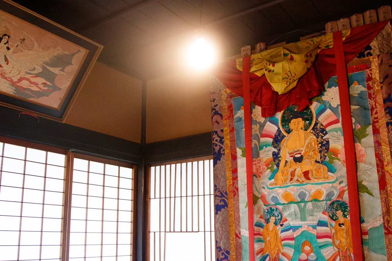 真光院本堂の外陣では、サカダワの期間中、ダライ・ラマ法王猊下の行事の時に何度も開眼して頂きましたアップリケの釈迦三尊像のタンカを開帳しております。さまざまな法事が催されます。サカダワ期間中は通常の10万倍の功徳があると謂れておりますので、みなさま随時お参りいただけますと幸いです。