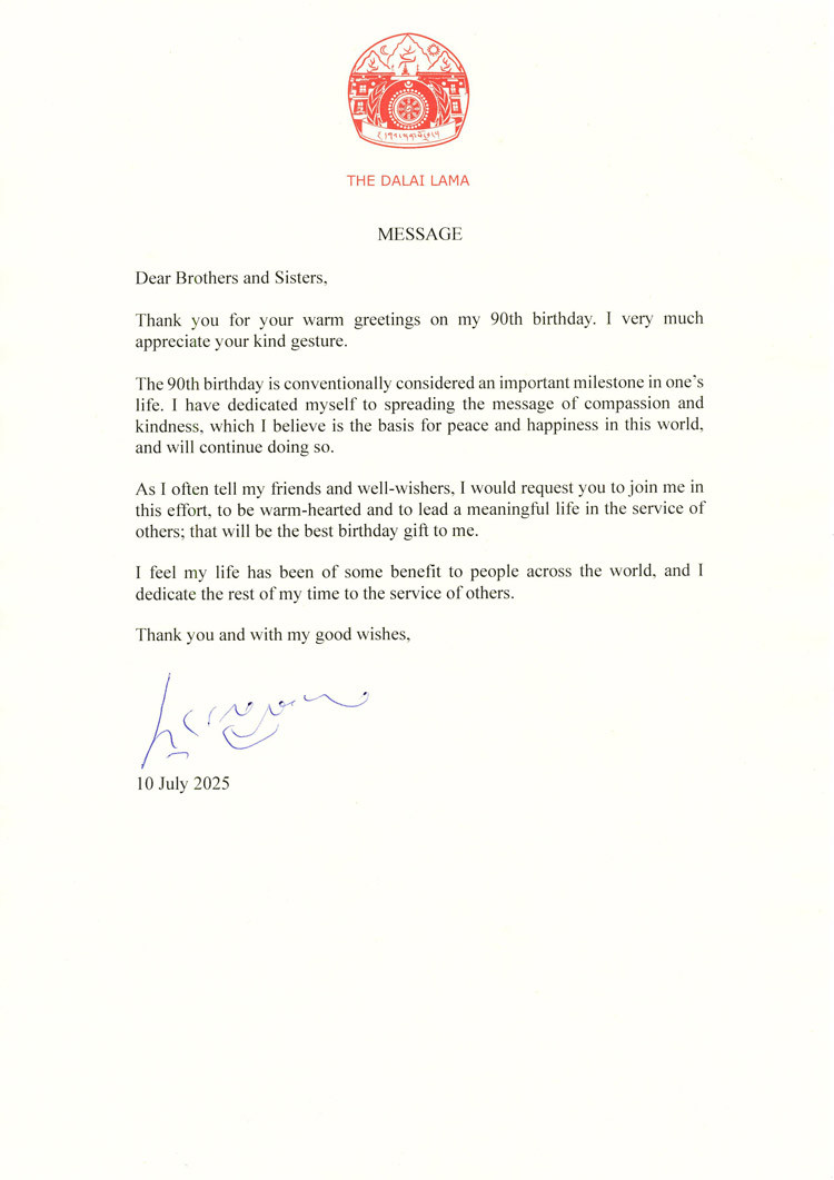 2025年7月11日、ダライ・ラマ法王猊下は先日来行われてきた満90歳のお誕生日の奉祝に関わったみなさまに対してお礼状を発表されましたので、ここに和訳してご紹介申し上げます。メッセージにもありますように、今後ともみなさまがダライ・ラマ法王猊下の他者のために尽くそうとする取り組みにご参画いただけますようお願い申し上げます。