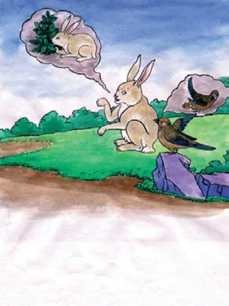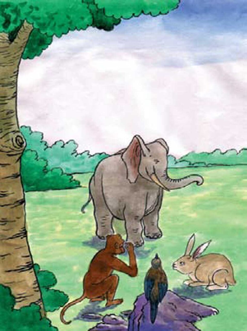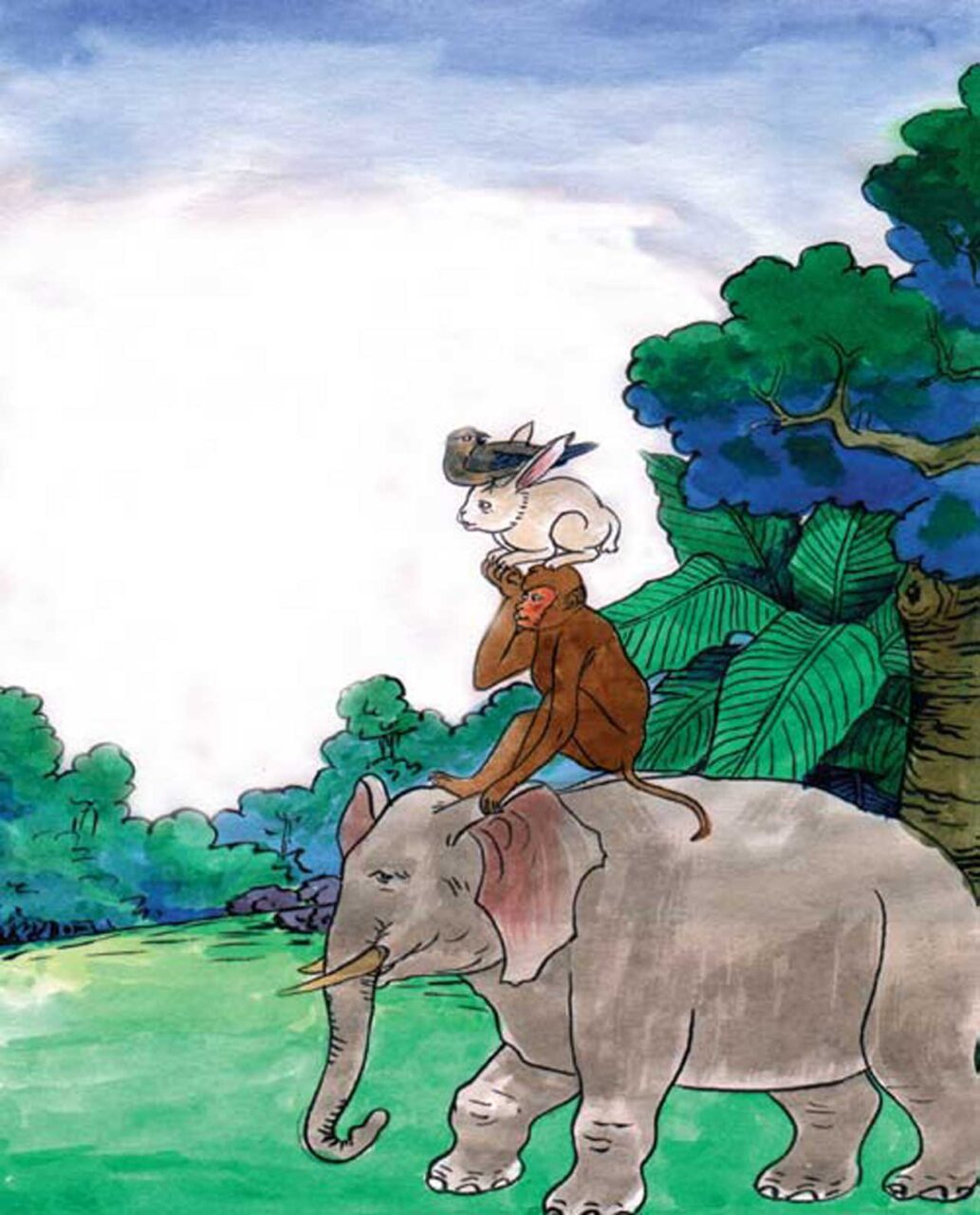 最初に象が「私が最初に昔主に連れられこの森にやってきた時、まだあの樹はちょうどいまの私の背丈くらいしかなかったものです」と言った。すると子猿は「私が主に連れられて来た時も、ちょうどいまの私の背丈くらいでしたよ」と言った。どうやら象よりも子猿の方が古参ということになるようである。それに続けて兎が「私が最初に来た時にはこの樹はまだ葉っぱが二枚しか生えていませんでした。私はその葉の上の水滴を舐めました」と言ったのである。すると雉は「皆さんはそんなに大きくなったこの樹を実際に見たんですか」と聞いたので、他の者たちは「確かに私がここにやってきてこの樹を見た時はそのよう位の大きさでした」とそれぞれ自分たちが見た時の大きさをはっきり覚えているといった。そこで雉は、「私が最初にここにやって来て見た時は、まだこの辺りには種が落ちているだけでした。私がここに糞をしたから、その後生えて来たのがこの樹ですね」と言ったのである。