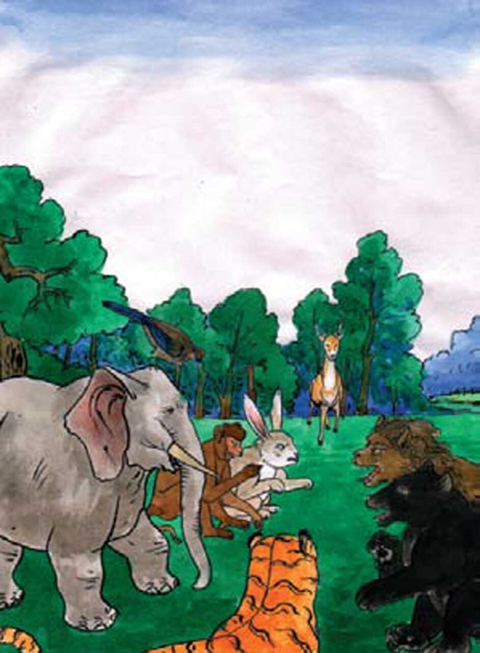 往古の昔、カーシ国には深い森があった。そこには雉と兎と小猿と象が本当の兄弟のように仲良く棲んでいた。互いに大変気が合い、常に仲良く楽しく過ごしていた。言い争って喧嘩をすることもないし、相手に傷つけられる恐れもなく、互いに信用し合って過ごしていた。
