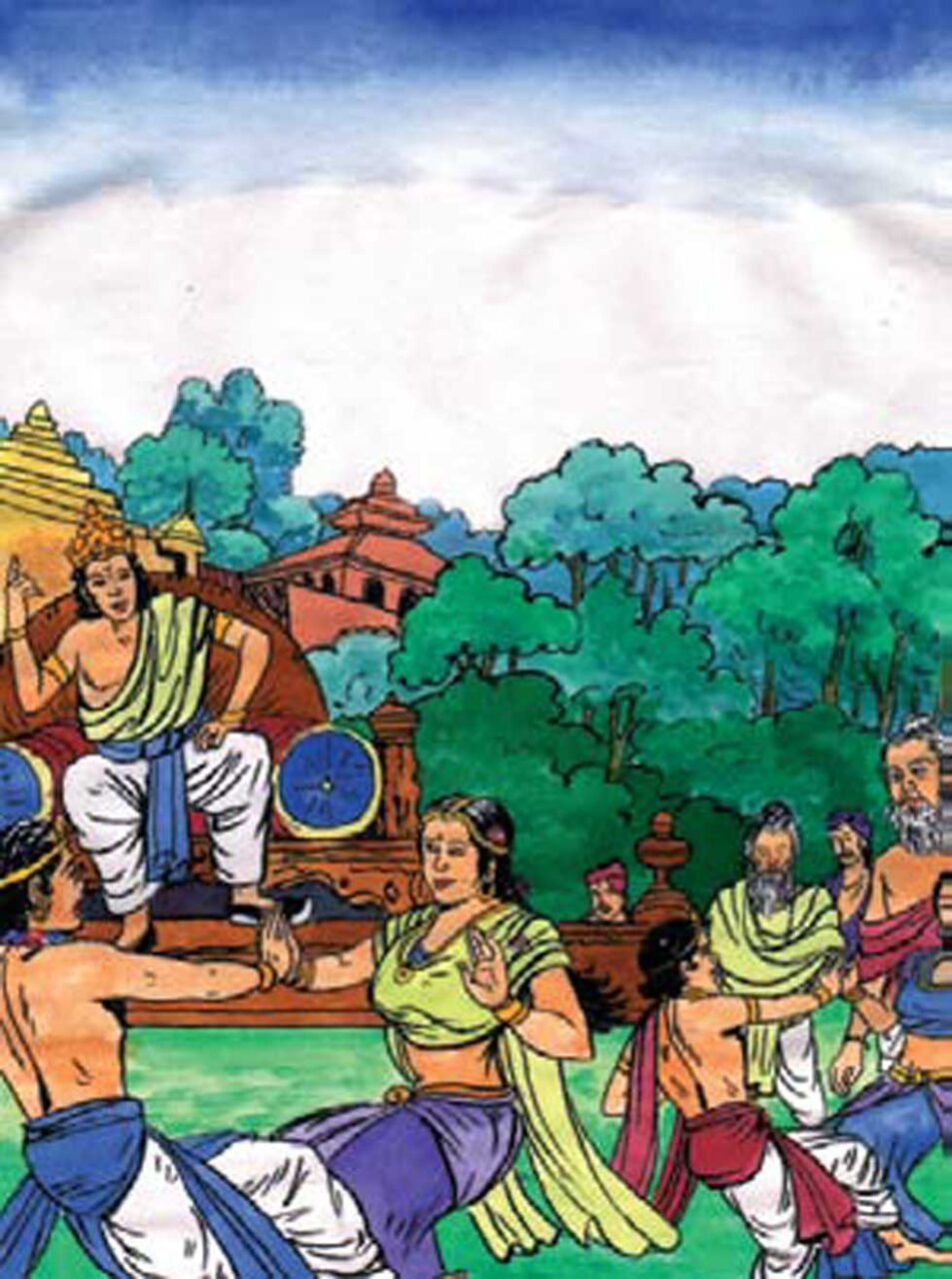 国王はそう言われたので「それが本当なら彼らを見つけだした方がいいでしょうか」と尋ねると、仙人は「偉大なる国王さま、彼らを探して一体何の意味があるでしょうか。それよりも、彼らが実践している正しい行いを皆さんも実践するようになさったらよいでしょう。彼らが実践していることは五戒と呼ばれるものです。」と答えたのである。国王が「偉大なる仙人さま、五戒とおっしゃるのは、どのようなものでしょうか。何をしたらいいのでしょうか」と続けると仙人はさらに答えていった。