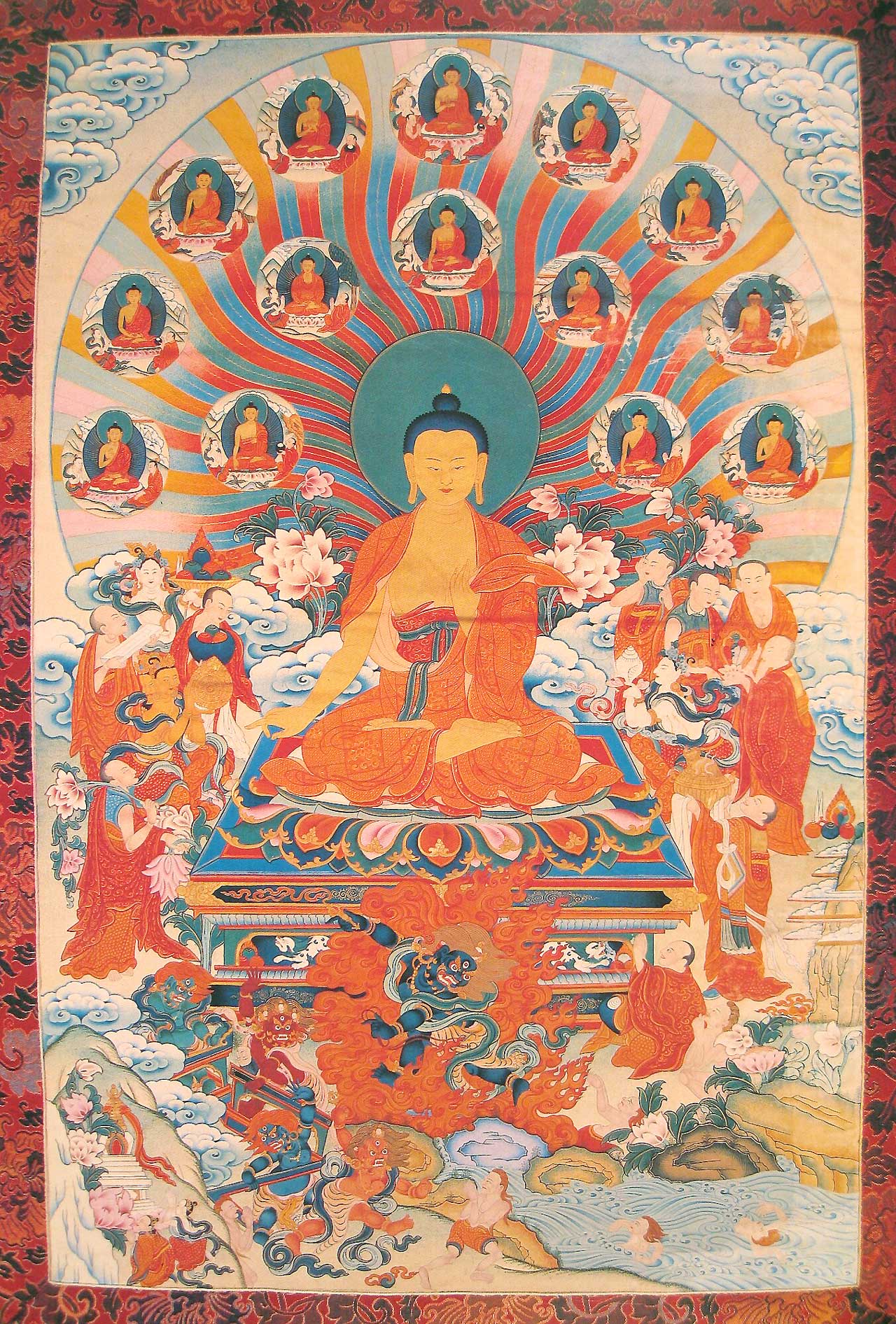 この後、釈尊はご自身の毛穴のすべてから八万の光線を放散させ、それが天空のすべてを覆うようにとなされた。これらの光線の一本一本の先端からは巨大な蓮華が化現し、その各々の蓮華座の上に、如来とその眷属を化現なされ、そのすべてが正法を説かれているものを化現なされた。周囲にいた大勢の観客のすべてに、そのような化身仏に直接会えるようになされると、彼らも更に一層の信心を起こすこととなった。そこでもまた釈尊はそれぞれ説法なされたので、彼らのなかには無上菩提へと発心した者も無数となり、果を成就した者たち、昇天した者たち、福徳資糧を起こした者たちも無数に出現することとなった。