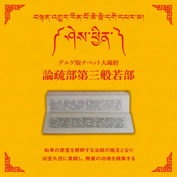 「チベット大蔵経論疏部」(テンギュル・丹殊爾)は、釈尊の御教えの真意を解釈するインド原典の論書をチベット語へと7世紀から500年以上の年月をかけて訳出したものを集成したもので、現在人類が保有するインド仏教の伝統的な注釈書の最大かつ最古のコレクションです。そのデルゲ版は、1744年に木版にて開版されたもので、正式名称を、「一切知者日親釈迦牟尼如来の仏語聖教を注釈する論書を雪国チベットの言語へと奉訳した一切の法施が不断に行われる神変の祖母・圓滿劫福徳雲海」といい、デルゲ大印経院にその原板の板木が今日も安置されていることから「デルゲ版テンギュル」と呼ばれるものであり、全213帙64512版あり、「テンギュル・リンポチェ」とも呼ばれています。