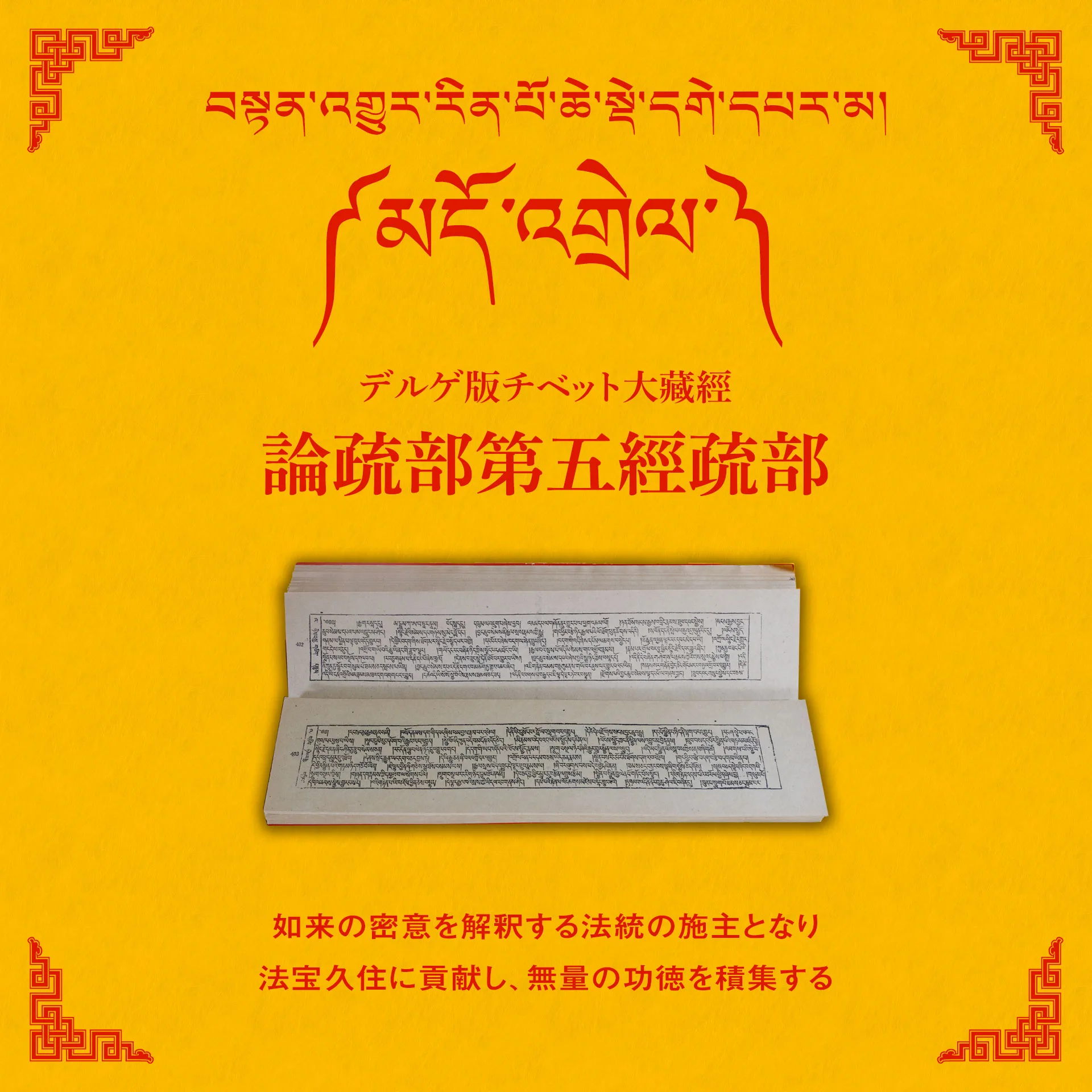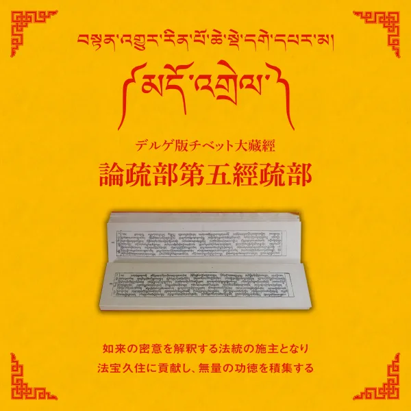 「チベット大蔵経論疏部」(テンギュル・丹殊爾)は、釈尊の御教えの真意を解釈するインド原典の論書をチベット語へと7世紀から500年以上の年月をかけて訳出したものを集成したもので、現在人類が保有するインド仏教の伝統的な注釈書の最大かつ最古のコレクションです。そのデルゲ版は、1744年に木版にて開版されたもので、正式名称を、「一切知者日親釈迦牟尼如来の仏語聖教を注釈する論書を雪国チベットの言語へと奉訳した一切の法施が不断に行われる神変の祖母・圓滿劫福徳雲海」といい、デルゲ大印経院にその原板の板木が今日も安置されていることから「デルゲ版テンギュル」と呼ばれるものであり、全213帙64512版あり、「テンギュル・リンポチェ」とも呼ばれています。