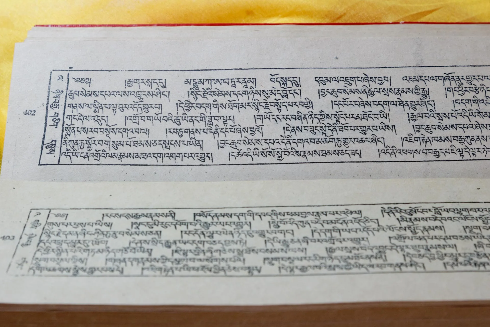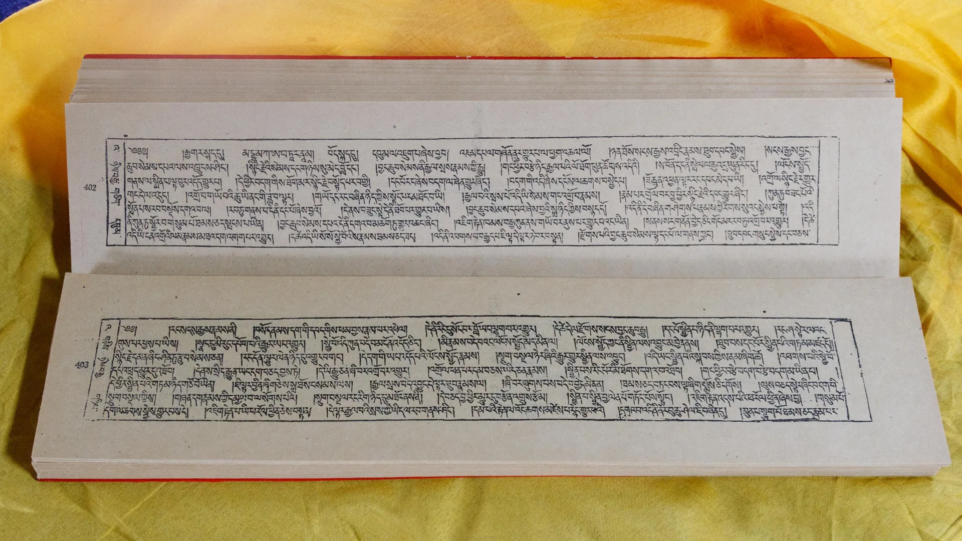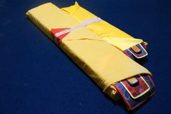 「チベット大蔵経論疏部」(テンギュル・丹殊爾)は、釈尊の御教えの真意を解釈するインド原典の論書をチベット語へと7世紀から500年以上の年月をかけて訳出したものを集成したもので、現在人類が保有するインド仏教の伝統的な注釈書の最大かつ最古のコレクションです。そのデルゲ版は、1744年に木版にて開版されたもので、正式名称を、「一切知者日親釈迦牟尼如来の仏語聖教を注釈する論書を雪国チベットの言語へと奉訳した一切の法施が不断に行われる神変の祖母・圓滿劫福徳雲海」といい、デルゲ大印経院にその原板の板木が今日も安置されていることから「デルゲ版テンギュル」と呼ばれるものであり、全213帙64512版あり、「テンギュル・リンポチェ」とも呼ばれています。