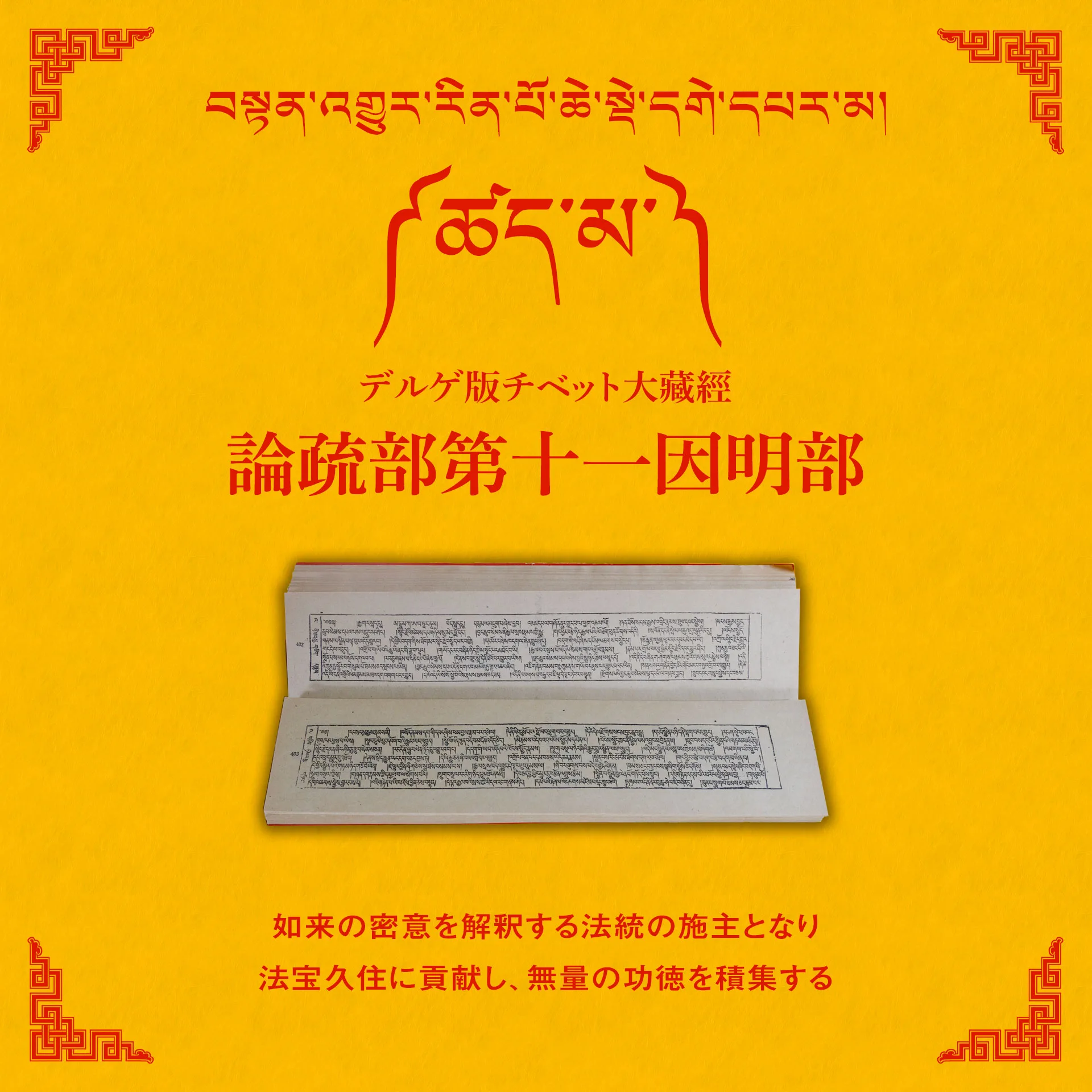 「チベット大蔵経論疏部」(テンギュル・丹殊爾)は、釈尊の御教えの真意を解釈するインド原典の論書をチベット語へと7世紀から500年以上の年月をかけて訳出したものを集成したもので、現在人類が保有するインド仏教の伝統的な注釈書の最大かつ最古のコレクションです。そのデルゲ版は、1744年に木版にて開版されたもので、正式名称を、「一切知者日親釈迦牟尼如来の仏語聖教を注釈する論書を雪国チベットの言語へと奉訳した一切の法施が不断に行われる神変の祖母・圓滿劫福徳雲海」といい、デルゲ大印経院にその原板の板木が今日も安置されていることから「デルゲ版テンギュル」と呼ばれるものであり、全213帙64512版あり、「テンギュル・リンポチェ」とも呼ばれています。