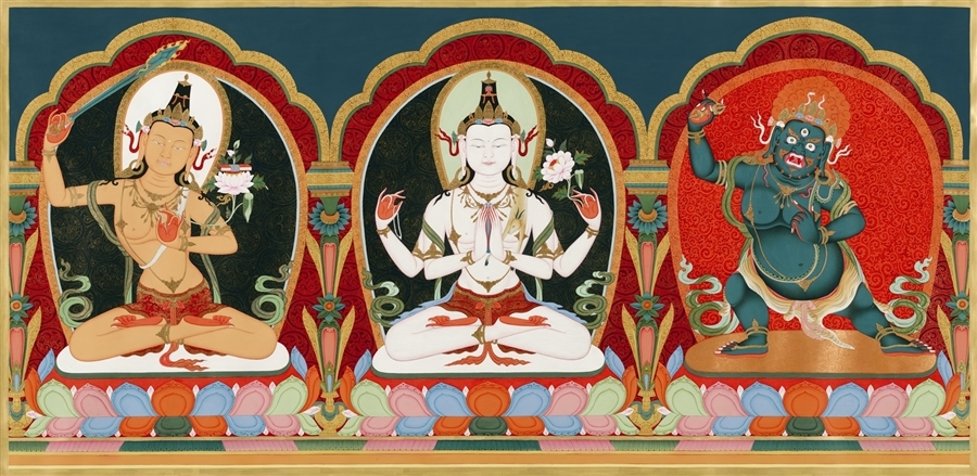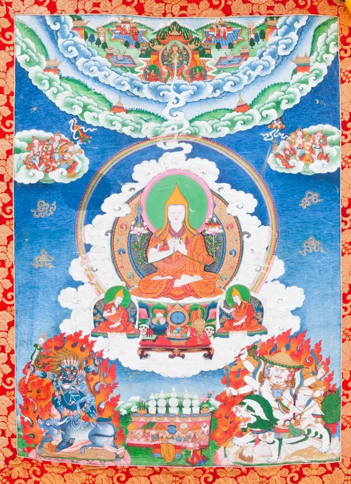 この度弊会では、チベット暦10月25日、ゲルク派の宗祖ジェ・ツォンカパ大師の遠忌「兜率五供」(ガンデンガチュー)にあたり、『兜率百尊頌』(ガンデン・ラギャマ)および『無縁頌』(ミクツェマ)に基づいて、ジェ・ツォンカパ大師および二大弟子をを観音菩薩・文殊菩薩・金剛手菩薩と一体に観想するための観想法をゴペル・リンポチェによって伝授していただくこととなりました。
