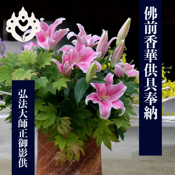 弘法大師の正御影供にあたり、薫り高い沈香の渦天香を炊き、美しい華を本尊や境内の随所にお供えし、如来・本尊・諸尊・眷属衆をお迎えします。諸尊が納受なされて歓喜なされることで、奉納する私たちが容姿端麗になり、身体からも芳香を発するようになることで、そこに佇んでいるだけで、周囲にいらっしゃる神々はもちろん、さまざまな衆生の視覚・嗅覚に善き影響を与え、衆生済度の活動を促進することができる功徳があります。特に使用する線香は、文化元年(1804)に広島で創業され200年以上も伝統的な沈香の線香を作りつづけている玉初堂の渦天香を使用し、12時間以上もその芳香は放たれ続けます。